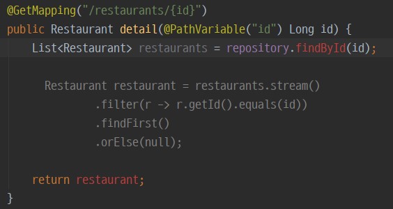 detail method의 내용도 findById를 통해 가져 온 가게 정보 하나만 반환해주도록 수정한다.
