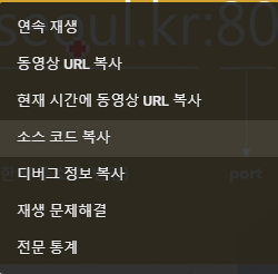 유튜브 동영상에서 우클릭하고 '소스 코드 복사' 클릭