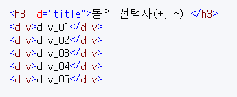 #title~div 의 경우에는 #title 의 다음에 나오는 div를 모두 지정해주는 선택자이다.